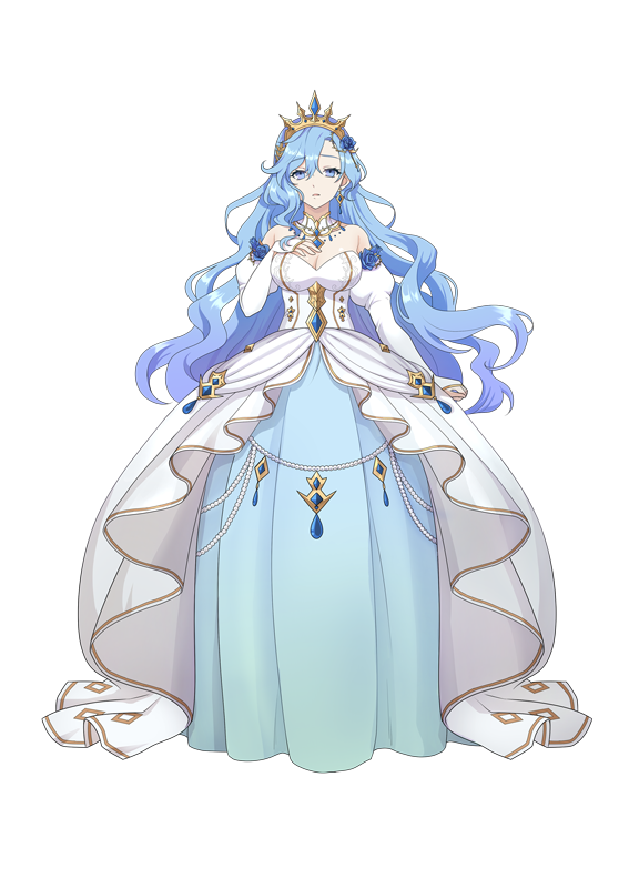 澄み渡る空のような明るい青色の髪が特徴的な、穏やかで物静かな女性で、常に周囲の人々の身を案じ、進んで働き掛ける献身さから、多くの国民から深く愛されている。