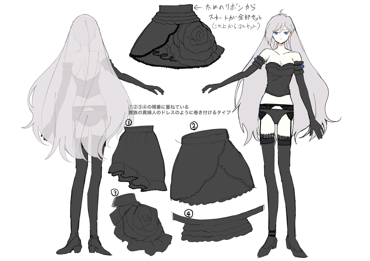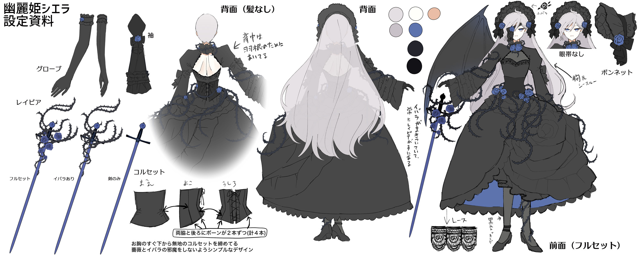大きな薔薇の花を象ったスカートが印象的な、全身を黒く染める可憐なドレスと、ライアを彷彿とさせる青い薔薇の数々と各部に巻き付く茨、そして青い剣身のレイピアが特徴的な姿である。