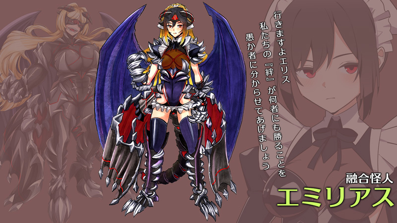 メイド部隊を率いる組織の幹部であるメイド戦闘員ミアが、部下である戦闘員エリスの怪人態:怪人エリスと融合して生まれる戦闘形態。