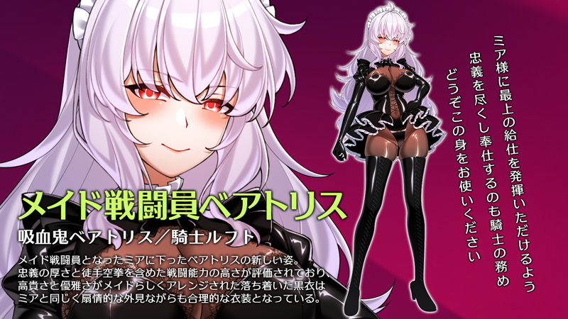 メイド戦闘員となり組織の幹部に重用されたミアの下で、同じくメイド戦闘員となったベアトリスの新しい姿。