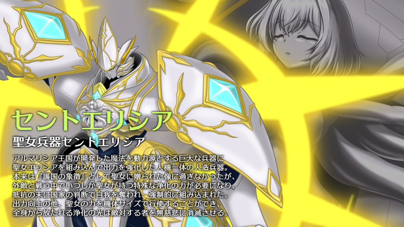 当初は権威付けのための偶像という想定がされていた聖女兵器だが、国内の魔物討伐や外敵との戦いが激化していく中でいつしか聖女が持つ特殊な浄化の力が必要になり、エリシアに聖女兵器を駆って出撃するよう命令が出される。