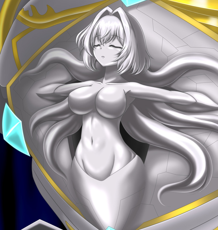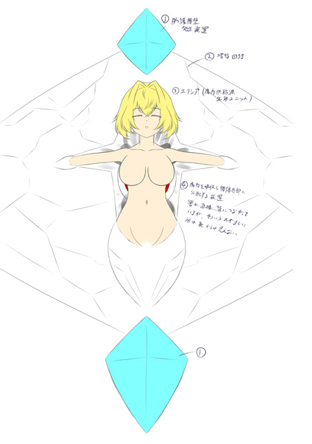 エリシアの肉体が冷たい金属製の物言わぬ胸像として機体の胸部に据え付けられる形で、「護国の象徴」として芸術品のように高く掲げられているのが特徴である。