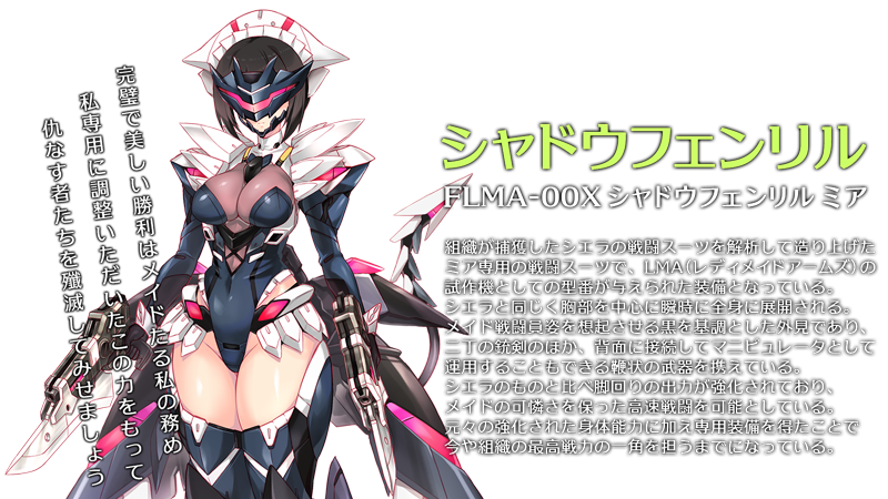 以降、メイド部隊に所属するメイド戦闘員たちに配備される想定で、LMA(Lady Maid Arms:レディメイドアームズ)シリーズと名前が付けられており、ミアの戦闘スーツには試作機としての型番と、専用名である「シャドウフェンリル」が与えられている。